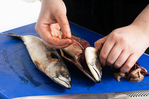 Самый долгий процесс — разморозка. Чтобы по максимуму сохранить натуральность рыбной мякоти, делать это лучше в холодильнике, выложив рыбину в дуршлаг, а снизу подставив миску, — плавать в собственной талой воде рыбе совершенно ни к чему. Дальше удалите жабры и внутренности. Если в вашем распоряжении потрошеная тушка без головы, достаточно ее хорошо промыть и обтереть бумажными полотенцами.