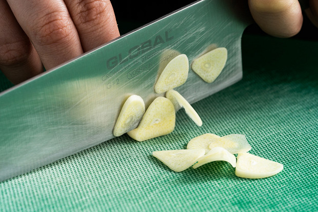 Возьмите 2 зубчика чеснока. Один нарежьте тонкими пластинками и пока отложите.