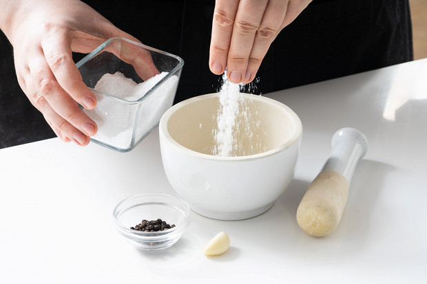 Второй зубчик выложите в ступку, добавьте по чайной ложке соли и перца-горошка и растолките все вместе.