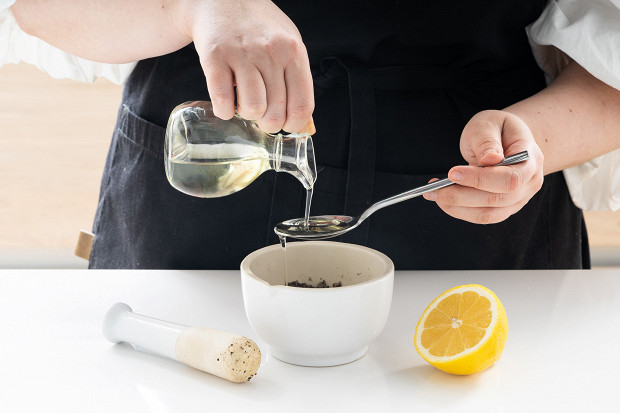 Выжмите в ту же ступку половину лимона, добавьте пару столовых ложек растительного масла, чтобы получилась паста.