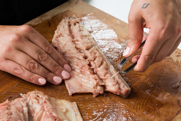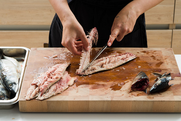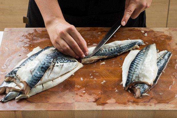 Также избавьте скумбрию от мелких костей. Скумбрия не самая костлявая рыба, и, вооружившись надежным пинцетом, можно ее довольно быстро почистить.