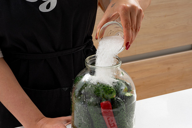 Сверху насыпьте соль. Соль может быть какой угодно: крупной или мелкой, йодированной или нет. Решать вам.