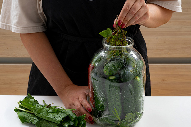На дно банки положите часть листьев, укроп и раздавленные зубчики чеснока. Все листья сразу класть не советуем — зелени полезно сосредоточиться в разных зонах банки. Чеснок же давить нужно для того, чтобы он лучше отдал ароматику. Но можно так и не делать.