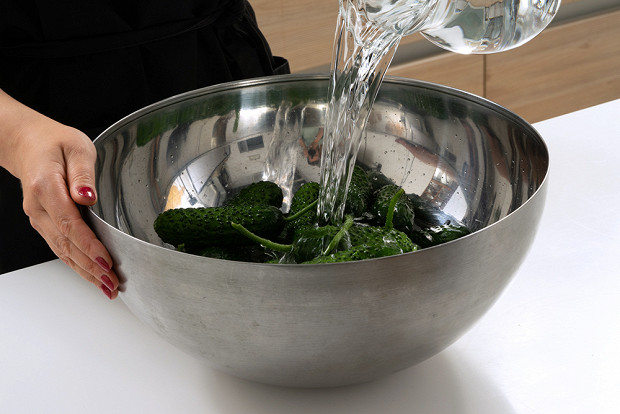 Залейте огурцы чистой холодной водой. В идеале это должна быть вода, пропущенная через фильтр. Либо магазинная негазированная вода, либо кипяченая вода.