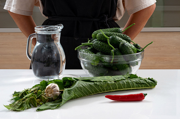 Подготовьте все ингредиенты: 2 кг огурцов, 80 грамм соли, 1 острый перец, 5–6 соцветий укропа, 5 листов черной смородины, 3 листа хрена, 4 зубчика чеснока и 1 литр воды. Промойте огурцы и всю зелень.