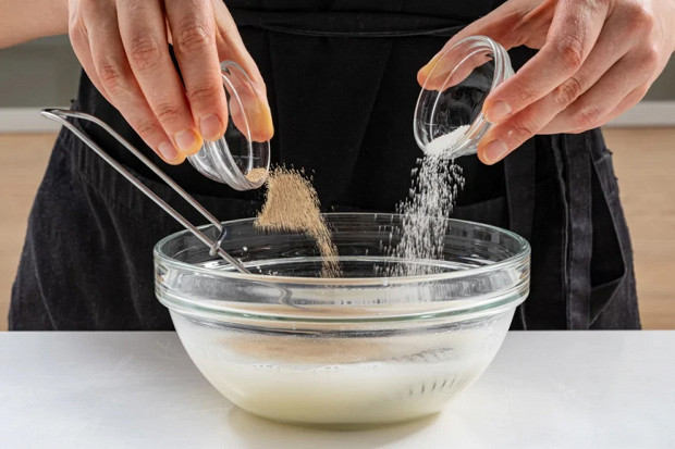 Добавьте в миску дрожжи и сахар. Тщательно перемешайте.