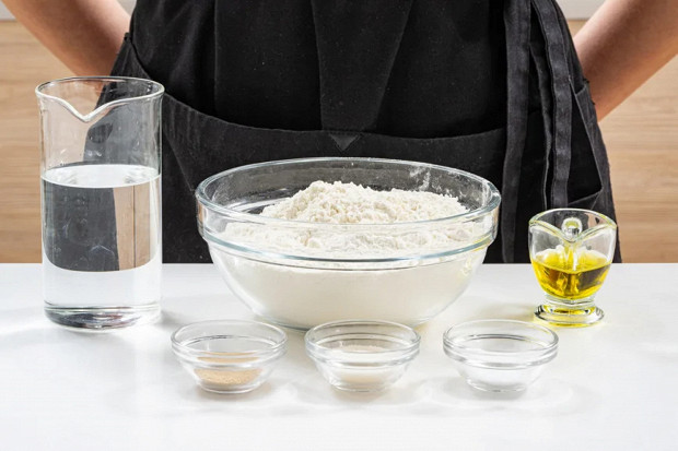 Приготовьте все ингредиенты для домашнего теста для пиццы. Вам понадобится 400 г муки, 260 мл воды, 8 г соли, 3 г сухих дрожжей, 10 г сахара, 20 мл оливкового масла.