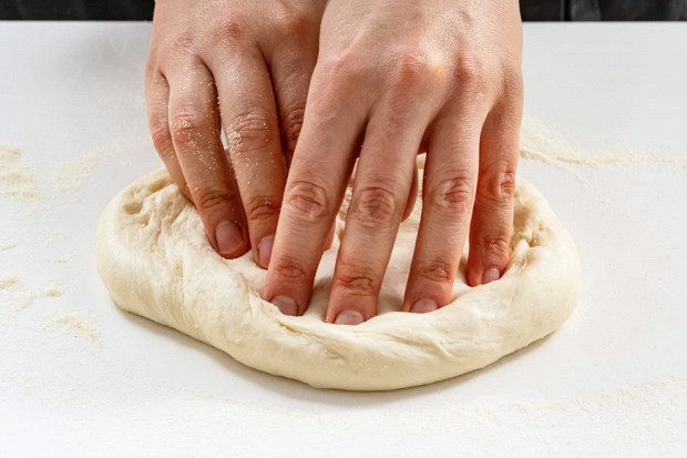 Чтобы тесто получилось воздушным, его важно правильно обмять. Для этого возьмите тесто обеими руками за середину и поднимите так, чтобы оно сложилось вдвое. И от души хлопните тесто об стол. Затем поверните пласт теста на 90 градусов, снова приподнимите и хлопните. Повторяйте до тех пор, пока тесто не станет легко отходить от поверхности стола.