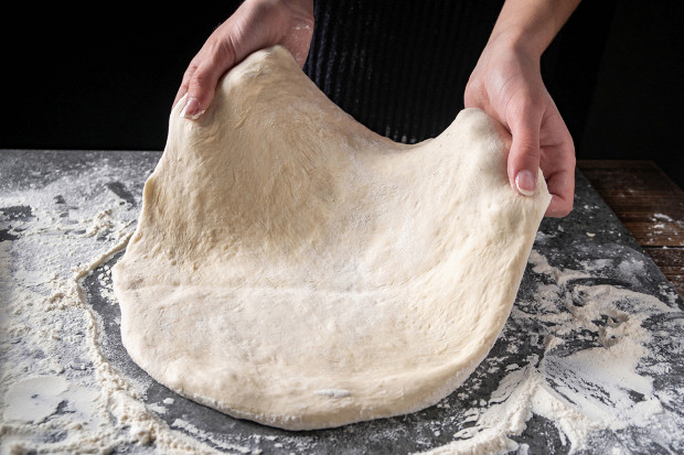 Приготовление лепешки. Растягивать тесто нужно только руками. Дело в том, что после нескольких часов подъема и расстойки тесто пронизано маленькими пузырьками газа, которые при резком нагреве расширяются и создают красивый рисунок лепешки и вкусную легкую корочку. А если тесто раскатывать, то скалка их раздавит.