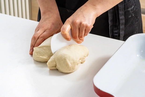 Тесто разделите пополам, скатайте каждую часть в шар. Выложите тесто на противень или в контейнер, смазанный оливковым маслом. Закройте крышкой или пленкой и оставьте при комнатной температуре на 4 часа либо в холодильнике на ночь.