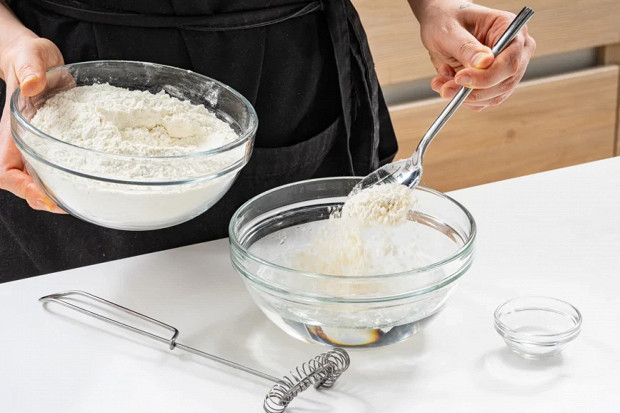 В миске смешайте воду комнатной температуры, соль и 2 столовые ложки муки. Это основа будущего теста.