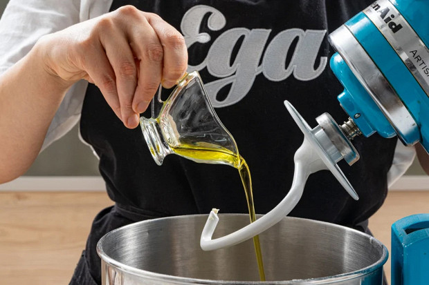 Как только тесто станет однородным, добавьте оливковое масло. Еще раз промесите тесто — оно должно быть податливым, но не прилипать к рукам.