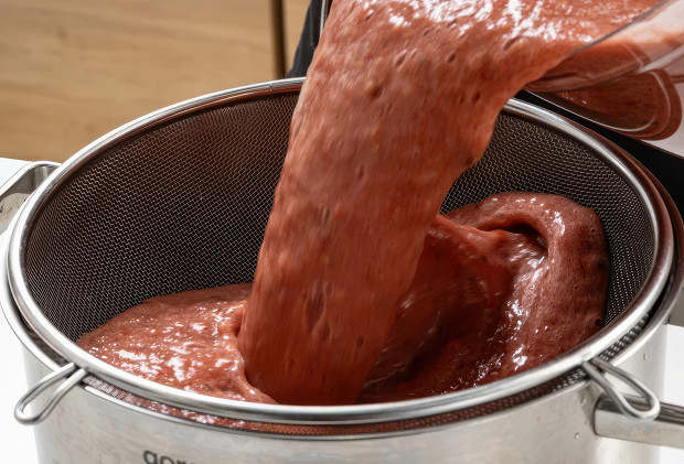 Получившееся пюре протрите через мелкое сито в кастрюлю. Протирать необходимо, чтобы отделить сок от семян и кожуры.