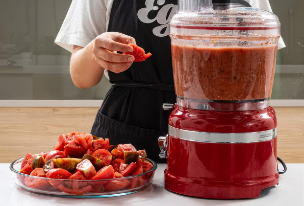 Переложите помидоры в чашу блендера и пробейте их до состояния пюре. Также можно воспользоваться погружным блендером или мясорубкой. Все эти приспособления куда проще соковыжималки и легко моются.