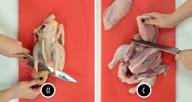 Лилия Байкеева (b): Срежьте с курицы филе и нарежьте его на мелкие аккуратные кусочки или пластиночки. Дома, в принципе, можно положить и целые крылья с ногами, но в ресторане так суп не подашь.