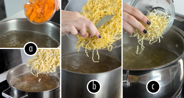 Раиса Агранат (c): Я беру магазинную лапшу. Когда я была молодой, мы с мамой делали сами лапшу, но сейчас она продается везде, и зачем себе устраивать этот кошмар, если ее можно купить в любом магазине. Я предпочитаю покупать яичную лапшу средней толщины — приятно, когда она чувствуется в супе. Нужно примерно 150 г.