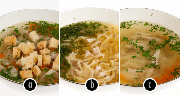 Ирина Волошина (a): Я наливаю в тарелку суп, добавляю туда куриное мясо, немного нарезанной петрушки и сухарики, которые готовлю из обычного белого хлеба в духовке. Сухарики нужно класть постепенно, иначе они развариваются.
