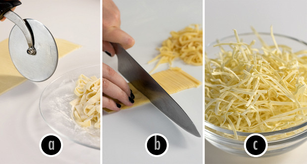 Ирина Волошина (a): Нарежьте лапшу ножом. Ширина и форма лапши может быть разной — кто-то любит широкую, кто-то любит тонкую, а кто-то любит лапшу квадратиком, но в этом случае, правда, не надо ее слишком тонко раскатывать.