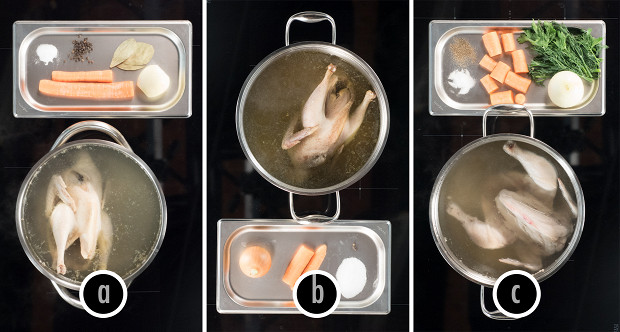 Ирина Волошина (a): Я кладу цыпленка в кастрюлю с тремя литрами воды. Если соблюсти эти пропорции, то в кастрюле окажется много-много курицы и мало-мало воды, а бульон получится жирный и наваристый. Когда вода закипит, я снимаю пену, уменьшая огонь, а потом кладу два лавровых листа, луковицу, морковь, соль и чайную ложку черного перца горошком — люблю, когда суп душистый и пахнет перцем. Курица варится на слабом огне полтора часа. Если на поверхности бульона выступают жирные пятна, снимите их и делайте это на протяжении всей варки. Бульон не должен быть жирным, он должен быть наваристым.