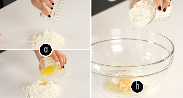 Лилия Байкеева (b): Добавьте к яйцу чайную ложку растительного масла и четверть стакана муки и начинайте замешивать тесто. А потом постепенно вмешайте в тесто еще четверть стакана муки — до тех пор, пока оно не станет крутым.