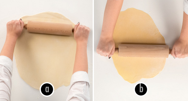 Лилия Байкеева (b): Когда тесто отстоится, раскатайте его на разделочной доске скалкой — так тонко, чтобы сквозь тесто была видна доска. Если у вас есть специальная тестораскаточная машина, то можно сделать и на ней, так даже удобней.