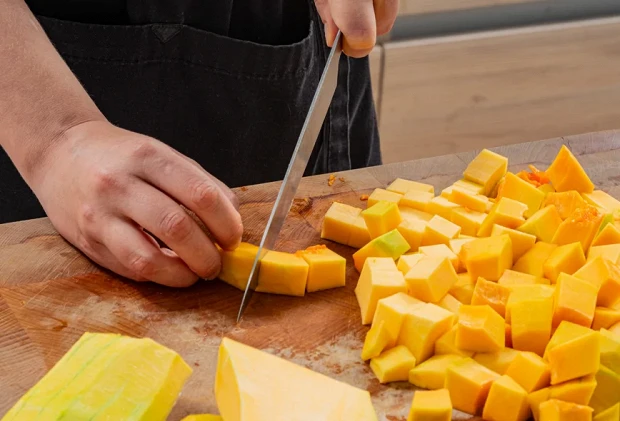 Тыкву очистите от кожуры и семян и нарежьте кубиками в 3–4 см.
