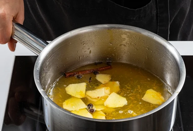 Доведите до кипения, добавьте сок цитрусов и уксус, закиньте в кастрюлю кубики тыквы.