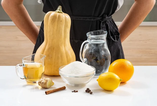 Подготовьте все ингредиенты. На 1 кг мякоти тыквы будет достаточно 1 апельсина, 1 лимона, 350 грамм сахара. Также для аромата стоит добавить палочку корицы, пару гвоздичек, 5 горошин душистого перца, 15 грамм имбиря и 120 мл яблочного уксуса.