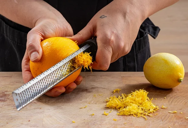 С апельсина и лимона снимите цедру мелкой терочкой, стараясь не задеть белую «вату».