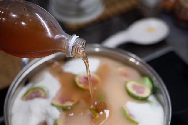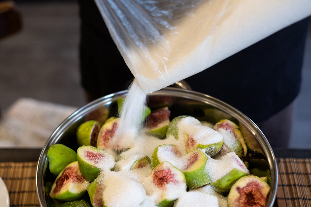Засыпьте инжир 2 кг сахара, накройте крышкой и оставьте на несколько часов, пока инжир не даст сок.