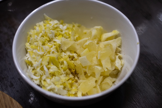 Натрите на терке цедру двух лимонов, можно прямо с белой шкуркой. Легкая горчинка нашему варенью совсем не помешает. Оставшуюся мякоть нарежьте на мелкие дольки. Можете выжать сок и использовать его вместо долек лимона. Мне нравятся дольки, потому что они красиво смотрятся в варенье, как цукаты. Особенно это красиво, если инжир в варенье цельный.