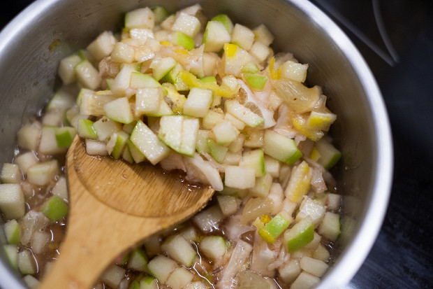 Варите, пока яблоко с лимоном не превратятся в плотную желеобразную массу, такую, что перевернешь сотейник — а она остается в нем. Вот такую.