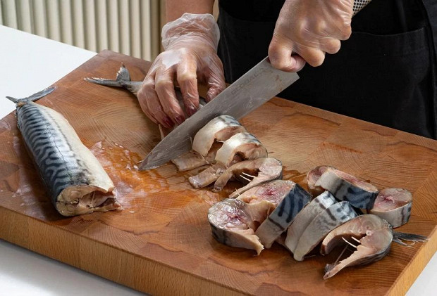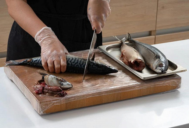 Непотрошеную рыбу выпотрошите, отрежьте голову вместе с жабрами, удалите плавники. Обязательно удалите черную пленку из брюшка рыбы — из-за нее рыба будет горчить и быстрее испортится.