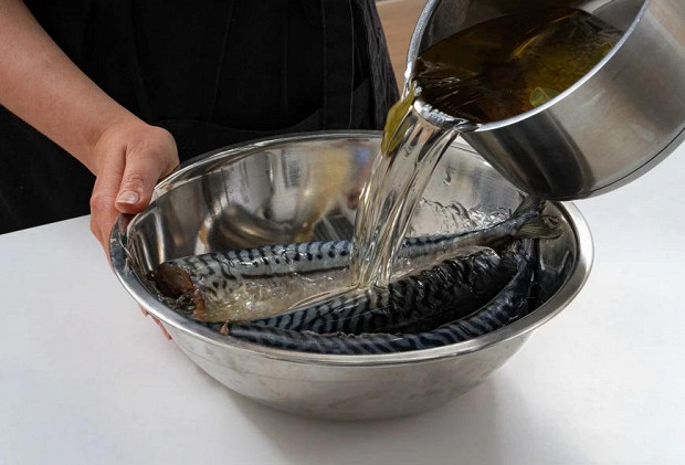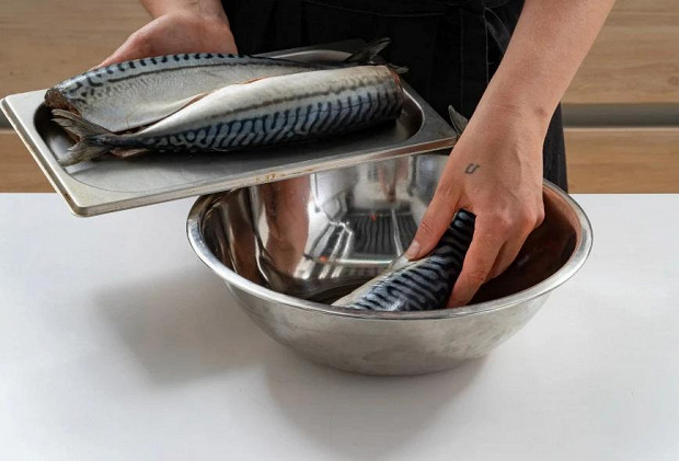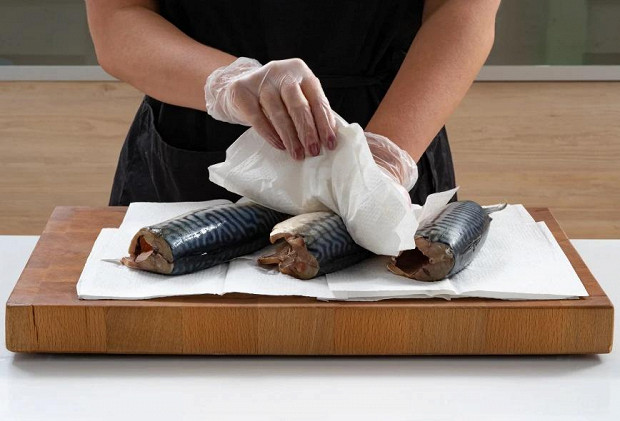 Перед подачей достаньте рыбу, промойте, чтобы избавиться от остатков рассола, и вытрите бумажными полотенцами.