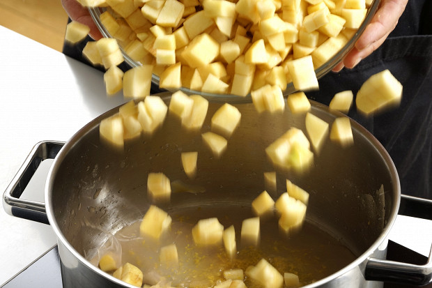 Отправьте яблочные кубики и цедру в таз, в котором только что варились шкурки.