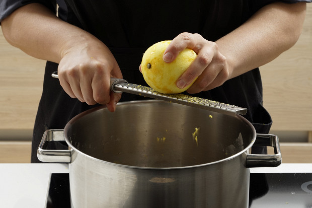 На мелкой терке натрите цедру одного лимона. Тут вам совсем не нужна белая часть цедры, она горчит. Но если эта горечь вам кажется привлекательной, смело добавляйте в таз целиком срезанную цедру.