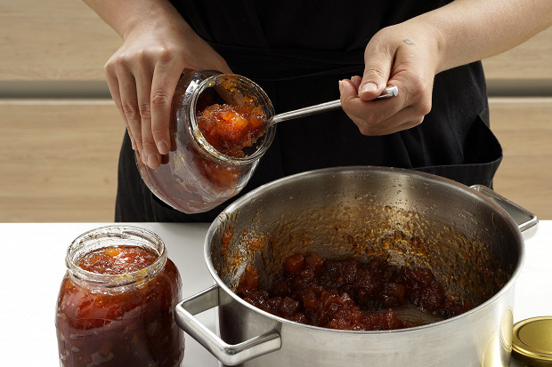 Вытащите из кастрюли палочку корицы, а готовый джем разложите по банкам.