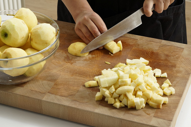 Нарежьте яблоки кубиками. Кубик может быть маленьким — тогда после варки он не сможет сохранить свою форму, и текстура джема будет близка к гомогенной. Или кубик может быть средним — тогда есть шанс, что в джеме будут попадаться красивые кусочки яблок. Такой джем, кстати, будет гуще. Решать вам.