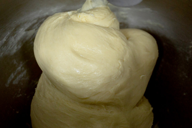 У вас должно получиться примерно 180 грамм заварки. Смешайте ее с 525 граммами муки, 11 граммами свежих дрожжей, 7 граммами соли, 83 граммами сахара, 38 граммами сухого молока, 150 граммами воды, 65 граммами яйца, 45 граммами сливочного масла в деже. Муку можно брать любую. Перемешивайте все сначала на минимальной скорости, минут через пять увеличьте до средней.
