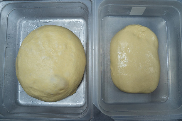 Тесто должно увеличиться в размере в два с половиной-три раза. Посмотрите на разницу. Это одно и то же количество теста до и после расстойки.
