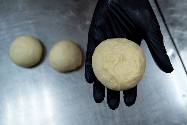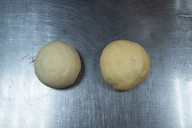 Разделите тесто на кусочки весом 120 грамм. Расплющите тесто ладонью, а затем скатайте каждый кусок в шарик или колобок и оставьте под пленкой отдохнуть на 10–15 минут. Каждый раз после манипуляций с тестом надо давать ему отдохнуть. Представьте, что тесто — это мышца, и при любом воздействии она напрягается. Неотдохнувшее тесто будет рваться.