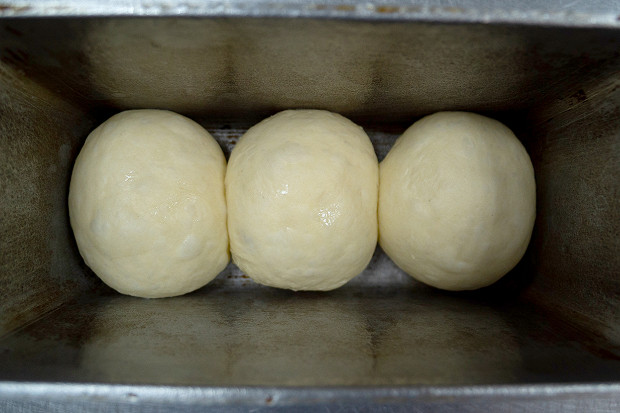 На самом деле тесто после обминки и расстойки можно было разделить на части побольше и положить их в формы целиком, а не по три шашечки. Вопрос красоты.