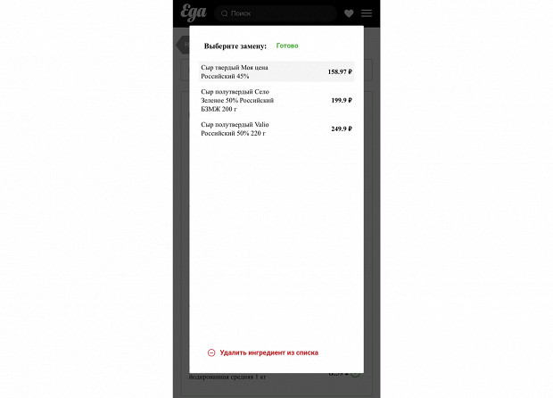 6. Затем нажмите на стрелочку около нужного (или ненужного) вам ингредиента. В открывшемся окне выберите опцию «Удалить ингредиент из списка» или замените его на один из представленных вариантов. Затем вернитесь к пункту 4: нажмите на зеленое окно «В корзину» и в приложении «СберМаркет» оформите заказ.