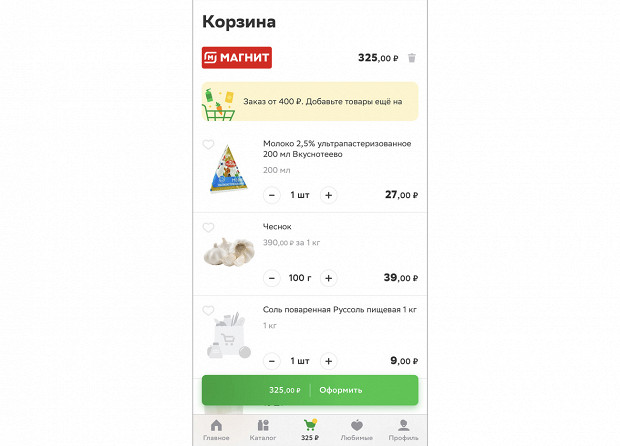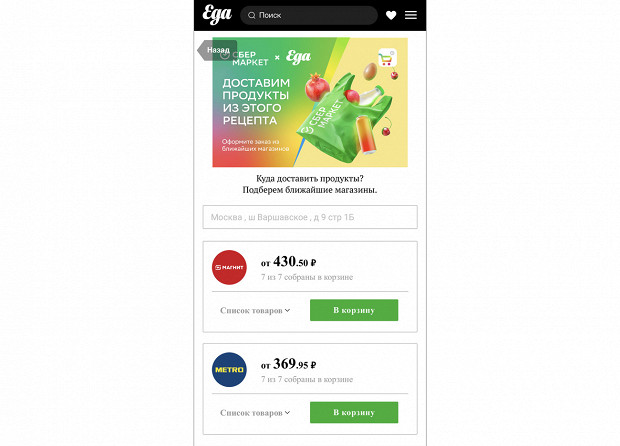4. На этом этапе вы можете нажать «В корзину». Сервис перебросит вас в приложение «СберМаркет», в котором можно оформить заказ. Если у вас не установлено приложение «СберМаркет», сервис направит вас на страницу для его скачивания. После скачивания продукты к рецепту появятся у вас в приложении.