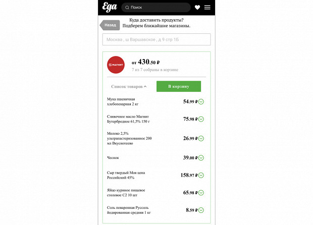 3. Ниже под полем для адреса вы увидите варианты корзин продуктов, сформированных с учетом того, какие магазины доставляют продукты по вашему адресу. Сервис покажет вам список магазинов. Выберите тот, который вам больше нравится, или тот, чья цена вас больше устраивает.
