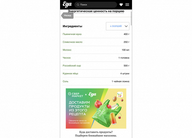 2. Под списком ингредиентов вы увидите зеленый баннер с надписью «Доставим продукты из этого рецепта».
