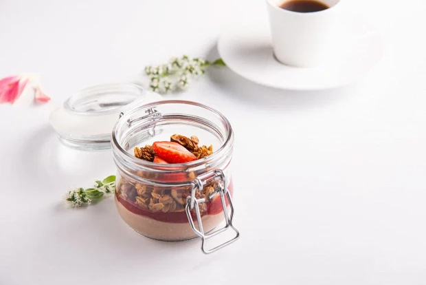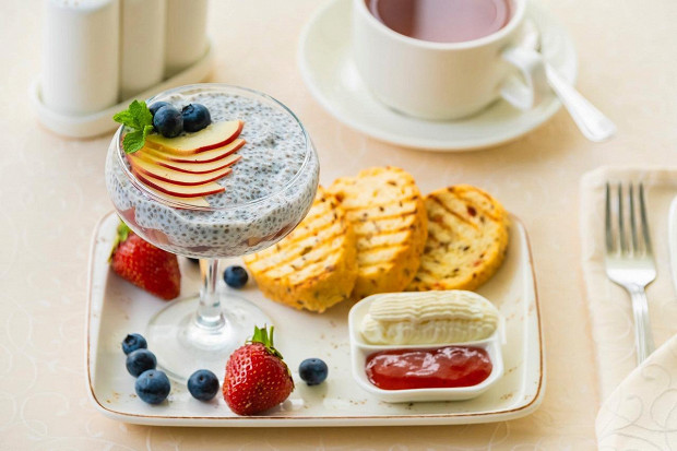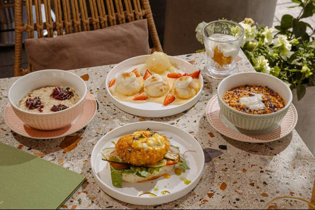 Белые скатерти, золотой декор, зеркала и хрустящие салфетки. Меню интерьеру под стать: пудинг из семян чиа с брюнуазом из персиков, домашняя гранола с клубникой и яблоком, молочная рисовая каша с клубникой и шоколадной пастой, салат с филе фермерской курицы и ароматными овощами.