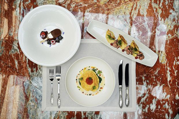 Во-первых, в гранд-лобби отеля «Метрополь» и баре «Шаляпин» очень красиво и атмосферно. И появление в меню яркого, сытного и оригинального сета — это дополнительный аргумент, чтобы провести вечер именно здесь. Вас ждут хумус с копченой утиной грудкой и чипсами из сельдерея, равиоли из мурманского лосося с северными креветками и молодым шпинатом с соусом на основе лемонграсса и с икрой кеты, на десерт же шоколадно-трюфельное эскимо.