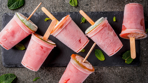 Замороженный арбуз. Нарежьте мякоть кусочками, сложите в один слой на застеленную пергаментом доску и отправьте в морозилку. Когда мякоть схватится, можно пересыпать кусочки-льдинки в пакет. После разморозки арбуз, конечно, размякнет, но для коктейлей, смузи и желе останется годным.