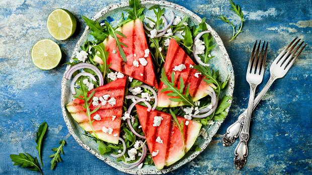 Классическая средиземноморская закуска — кусочек арбуза, обернутый сырокопченым окороком. И еще один эффектный ход — добавить ломтики арбуза в салат с помидорами, моцареллой и беконом, заправив его классическим соусом винегрет: две части растительного масла, часть лимонного сока, соль и перец.